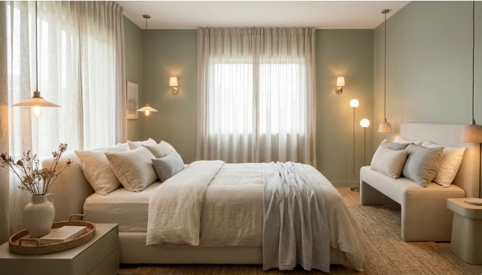Start with A calm color scheme to create a cozy and balanced bedroom atmosphere, then enhance the mood with Warm lighting and lamp placement to support comfort and relaxation. Focus on Functional furniture and table surfaces so your space stays practical as well as stylish, and add Soft bedding and layered pillows to increase comfort and visual depth.
