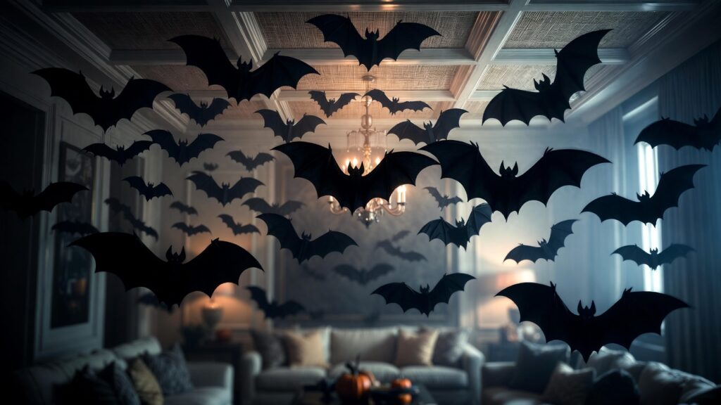 Paper bats are timeless and versatile. Arranged in flying patterns, they create dynamic motion across walls, making them ideal for living room decoration indoor setups.