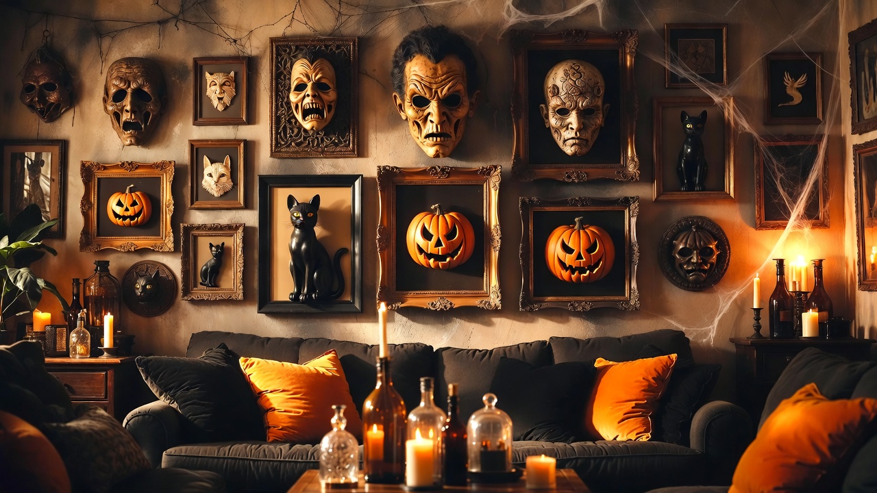 Creating a gallery of vintage masks brings depth to your haunted living room ideas. Old-style masks mounted on the wall add mystery and storytelling, making them ideal for halloween decorated living room aesthetics.