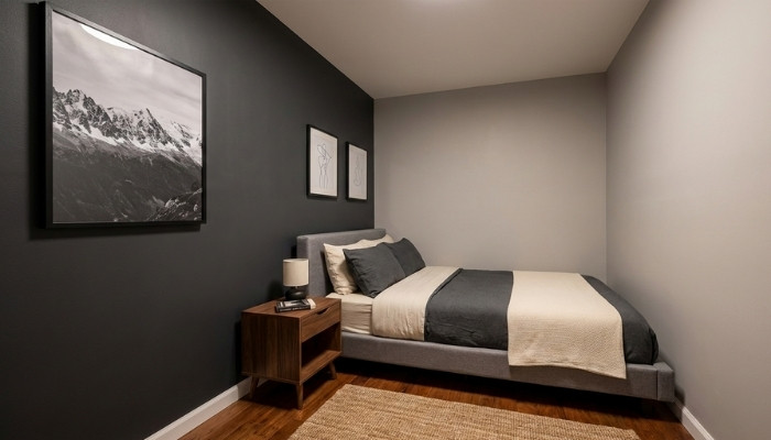 Neutral tones like gray, beige, navy, olive, and charcoal work well for small bedrooms. These colors create a masculine feel while keeping the room visually calm. Pairing darker shades with lighter bedding or walls prevents the space from feeling too heavy.