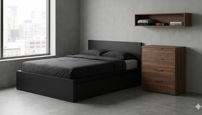 Low-profile beds, slim bedside tables, and furniture with built-in storage are ideal. Multi-functional pieces like beds with drawers or storage benches help maximize space while keeping the room organized and practical.